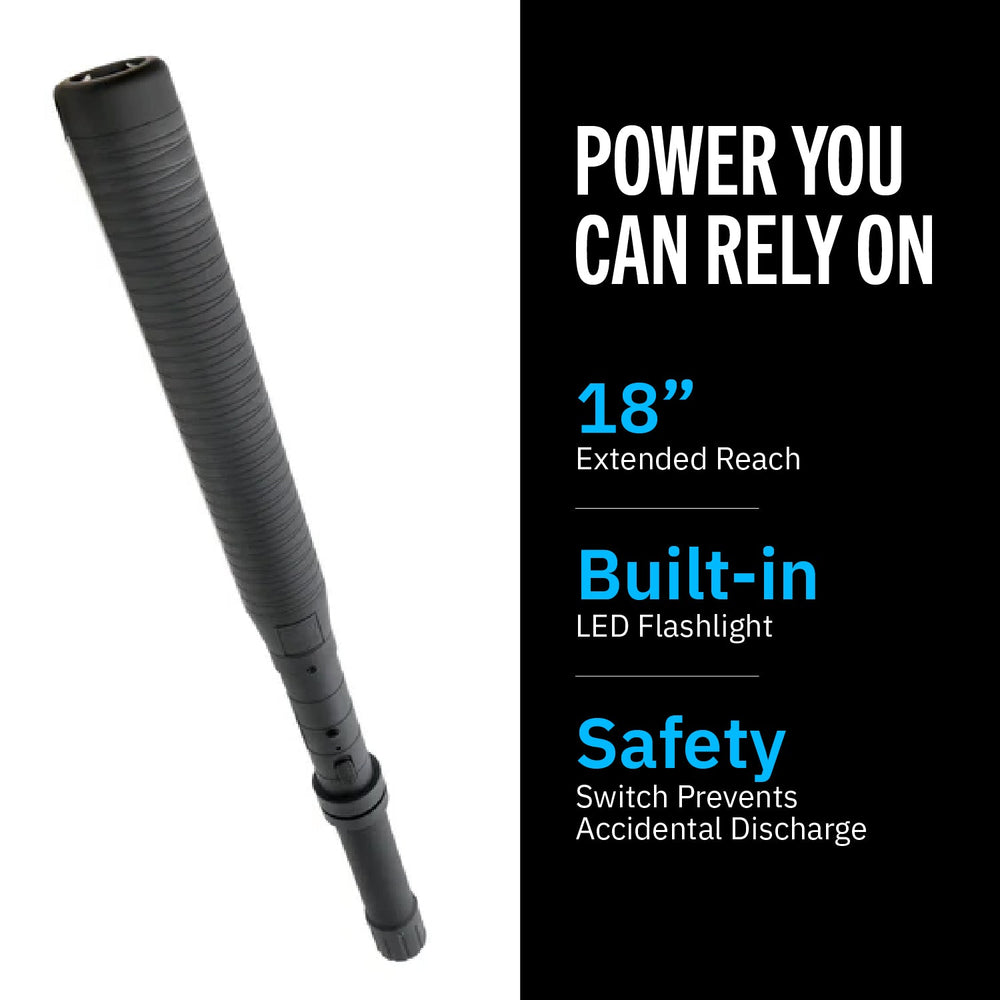 Combining reach, reliability, and convenience, this 18" baton delivers a potent charge and bright LED illumination in one rugged tool. The safety switch helps prevent accidental discharge, making it the ideal balance of strength and control.