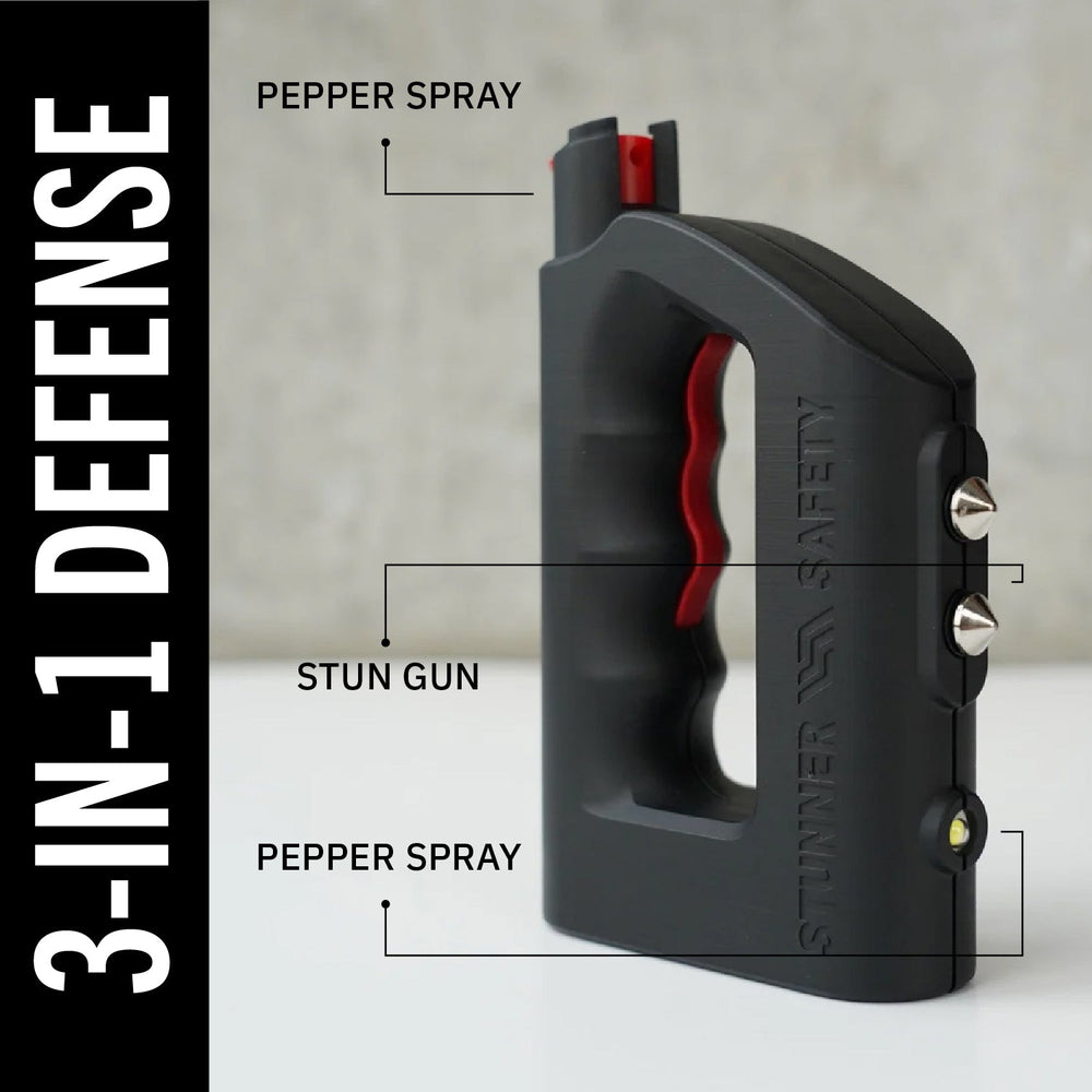 - 3-in-1 self-defense tool combines a stun gun, pepper spray, and flashlight in one body